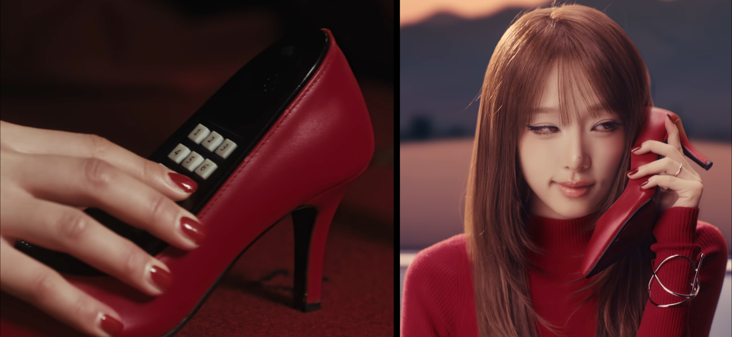 MV는 하이힐 모양 전화기로 번호를 누르는 소리와 함께 시작된다.