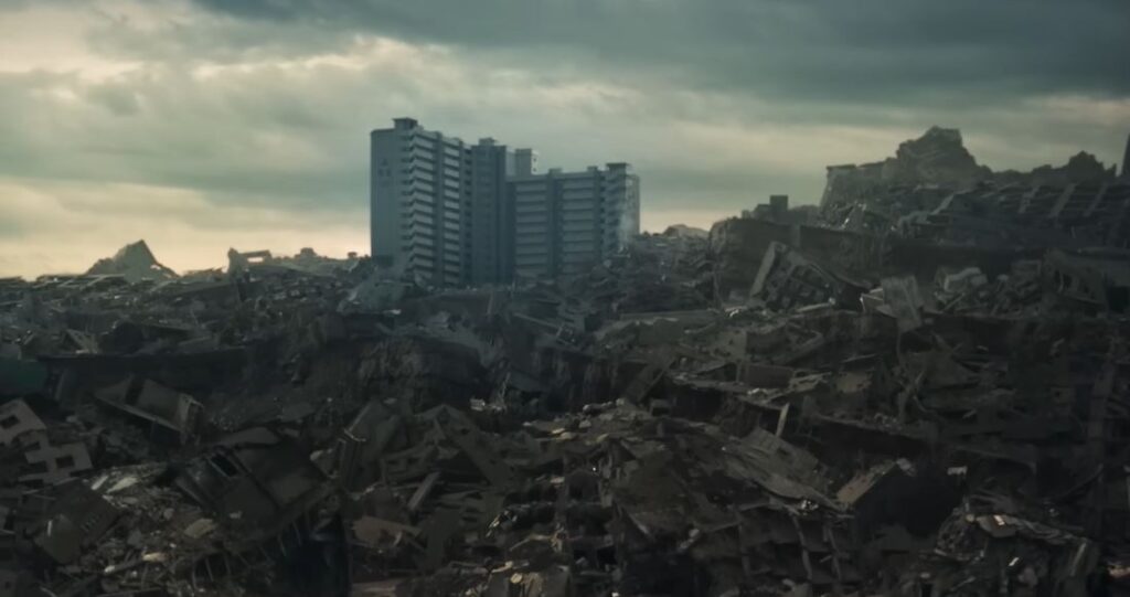 이 영화는 콘크리트 마켓은 대지진 이후 대부분의 도시가 붕괴된 포스트 아포칼립스 세계를 배경으로 한다. 이 작품은 단순한 재난 영화가 아니라, 재난 이후 인간이 어떤 방식으로 질서를 재구성하는지를 보여주는 작품이다. 그리고 이 영화의 배경은 “유일하게 무너지지 않은 아파트 단지”이며, 이 공간은 폐허가 된 외부 세계와 대비되는 생존자들의 마지막 거점이다. 이곳에서 사람들은 더 이상 돈을 사용하지 않고, 통조림·식량·약품 같은 생존 물자를 화폐처럼 사용한다.