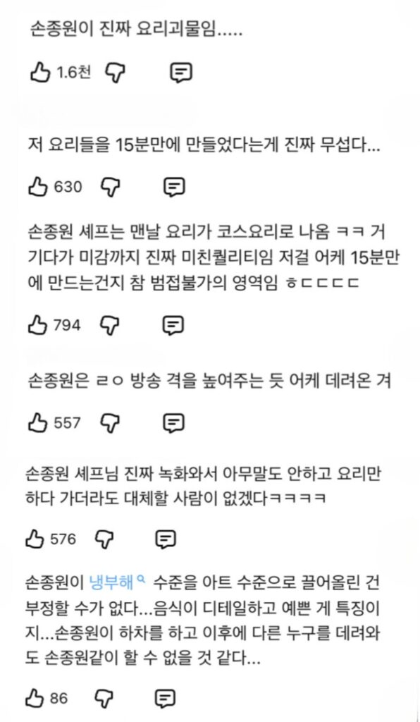 시청자가 그에게 더 열광하는 이유는, 그가 담아내는 섬세함과 아름다움이 15분이라는 시간을 활용했다고 믿기 어려운 정도이기 때문이다. 또, 그가 내는 요리의 조화와 애티튜드는 상황에 따라 기복이 없고 늘 일정하다. 모든 셰프가 노력하지만, 손 셰프는 디테일을 살린 이 모든 요소가 하나의 ‘집합체’가 되어 매번 빠짐없이 구현된다는 점에서 독보적이다.