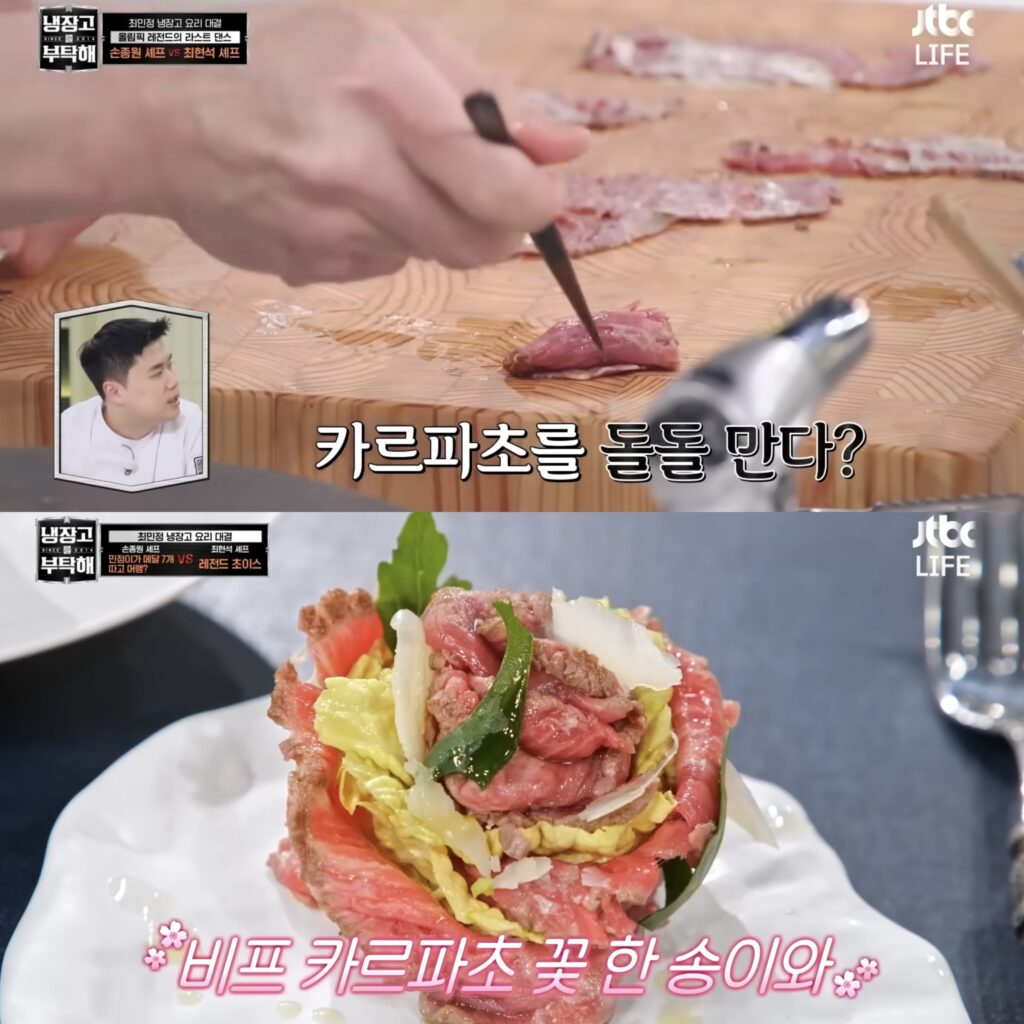 지켜보는 셰프들 모두 왜 고기를 마는지 의문을 가졌지만, 잠시 뒤 완성된 것은 아름다운 장미 모양의 ‘카르파초’였다. 한시가 급한 상황에서 게스트를 위해 ‘푸드 아트’를 완성해 나가는 모습은 모두의 감탄을 자아내기에 충분했다.