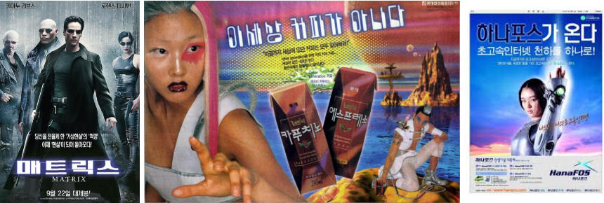 ▲ 1999년 개봉한 매트릭스(영화)와 당시 세기말 광고들. 첨단기능과 가상현실, 사이버틱함을 내세운 이미지