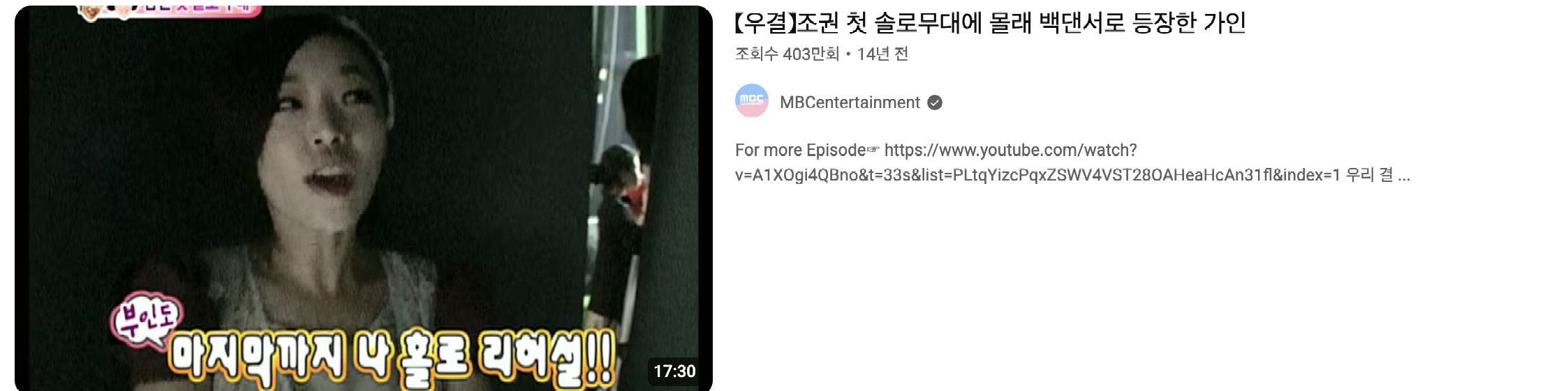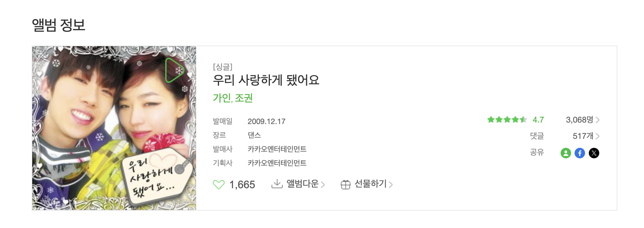 ‘우결’을 계기로 탄생한 조권의 솔로곡 <고백하던 날> 역시 ‘가수 부부’로서의 매력을 극대화한 에피소드다. 특히 첫 무대 당시, 가인이 바쁜 스케줄을 쪼개 몰래 안무 연습을 한 뒤 깜짝 등장했던 장면은 이들 서사에 잊지 못할 결정적 장면으로 남았다.