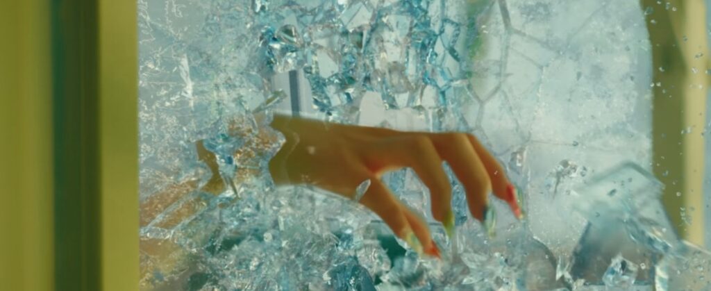 아이브- <해야> MV 중 한 장면.  유리 너머 호랑이의 실루엣이 비치다가 손이 튀어나와 유리창을 깨버린다. <해와 달이 된 오누이> 속 손에 분칠을 한 채 어머니인 척 손을 내미는 호랑이가 연상되기도 한다.