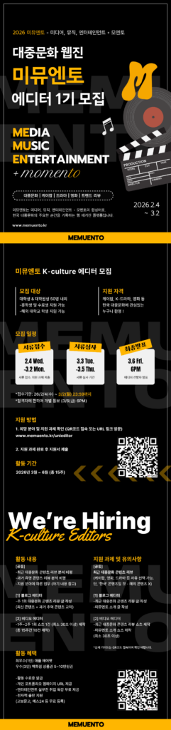 2026 미뮤엔토 대학생 에디터 1기 모집 | K-pop, 드라마, 영화 리뷰어들 모여라!