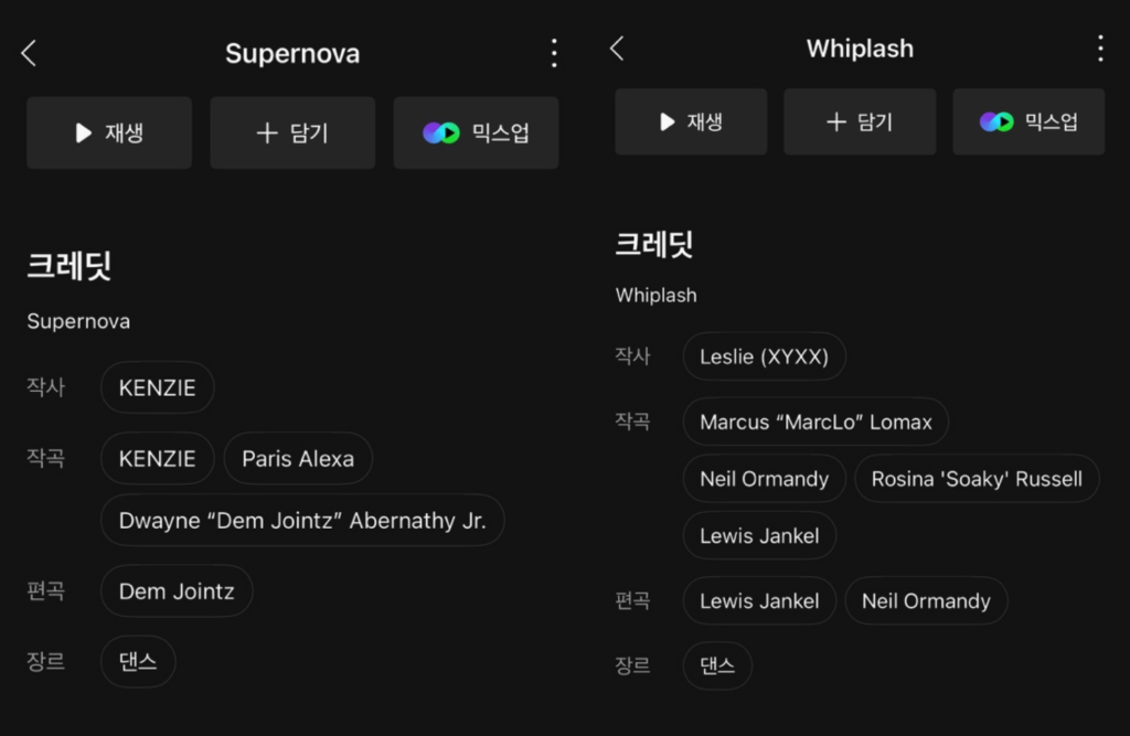 [출처: 멜론. 2026. ‘Supernova’, ‘Whiplash’ 멜론 곡 정보 페이지]